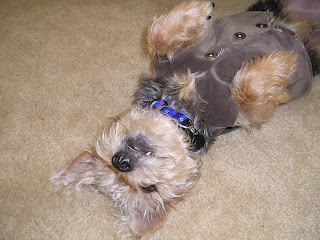 So, I always think Teddy would be pretty cute in puppy clothes, but I can't justify spending money on something like that right now. Luckily I had some spare material laying around and a little sewing machine my mom had gotten for me (see, I told you I'd use it, Mom...). ;-) The craftsmanship is not great - I'm not very good at sewing, but I still think it's pretty cute on him. He needs a haircut, but he still manages to pull of the GQ look. :-)