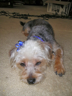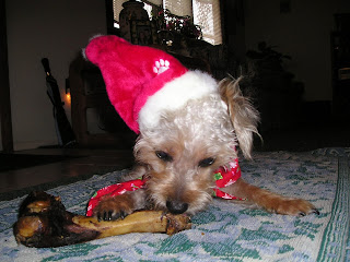 Teddy spent the day with the babysitter (Daniella) who took very good care of him despite his being a whiner. Teddy also got a chance to meet the Reeds' dogs and cats and thoroughly enjoyed his time at their house. He seemed to fall right in with the pack. We loved visiting with the Reeds and are looking forward to when they visit CA in March. Teddy enjoyed it the most - the dogs taught him how to go potty when the ground is covered in snow (he couldn't figure it out on his own) and Marilu got him a Christmas bandana.
